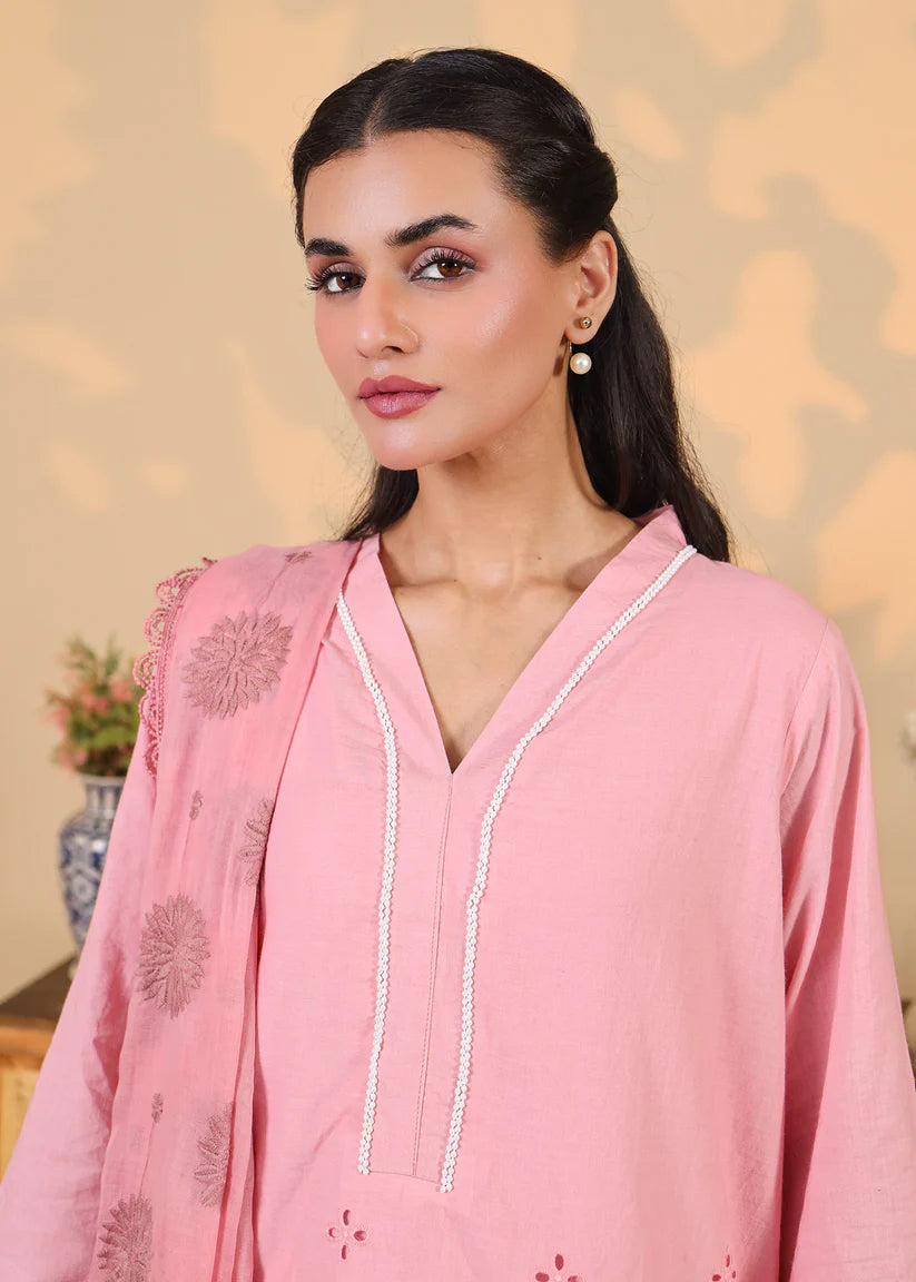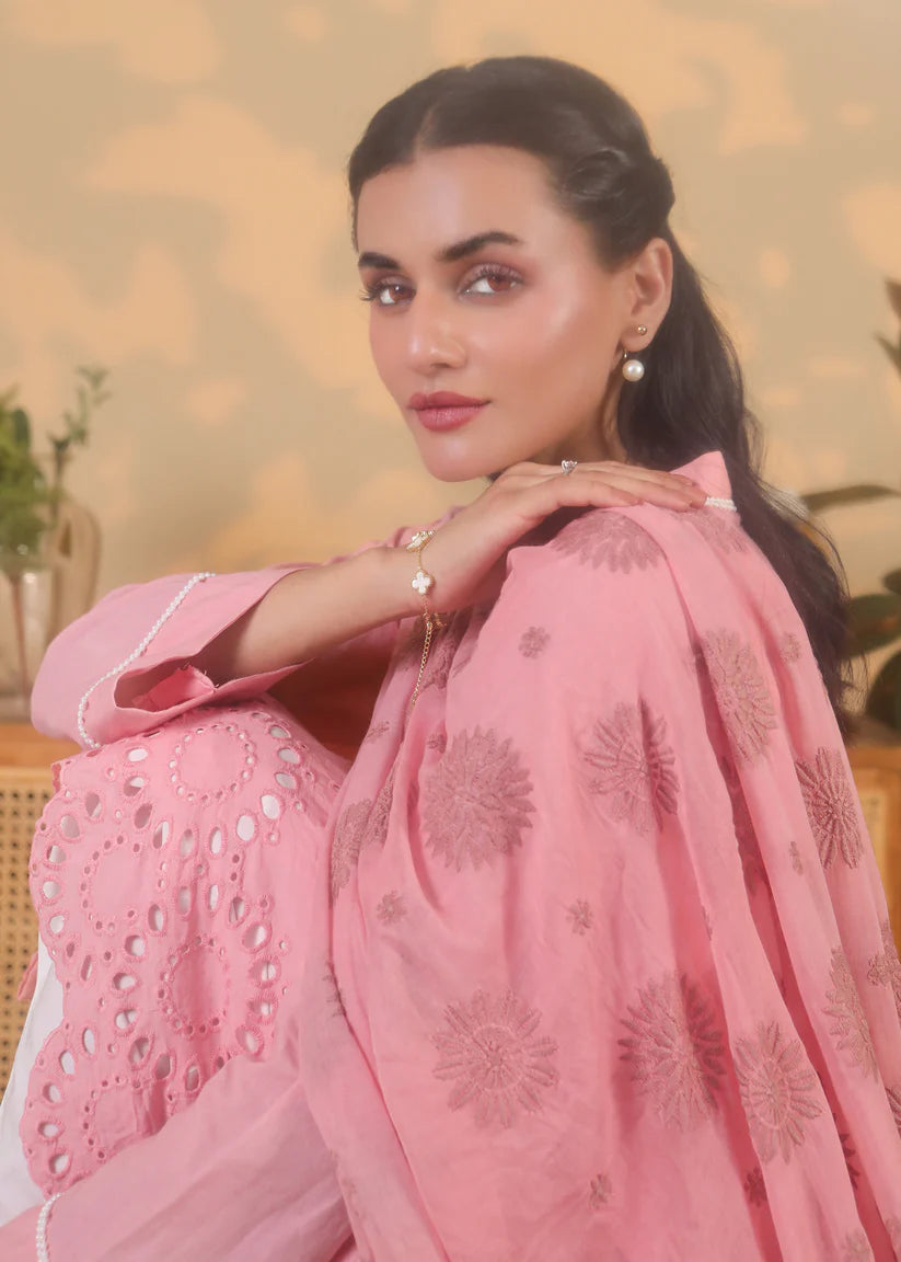 Key Features:3-piece set: shirt, tulip pants, and dupattaColor: Blush pink (top and dupatta), White (pants)Fabric: 100% breathable cottonDesign: Eyelet embroidery, scalloped hem, contrast piping on neckline & sleevesFit: Relaxed and flatteringOccasion: Festive, Casual, Summer Events