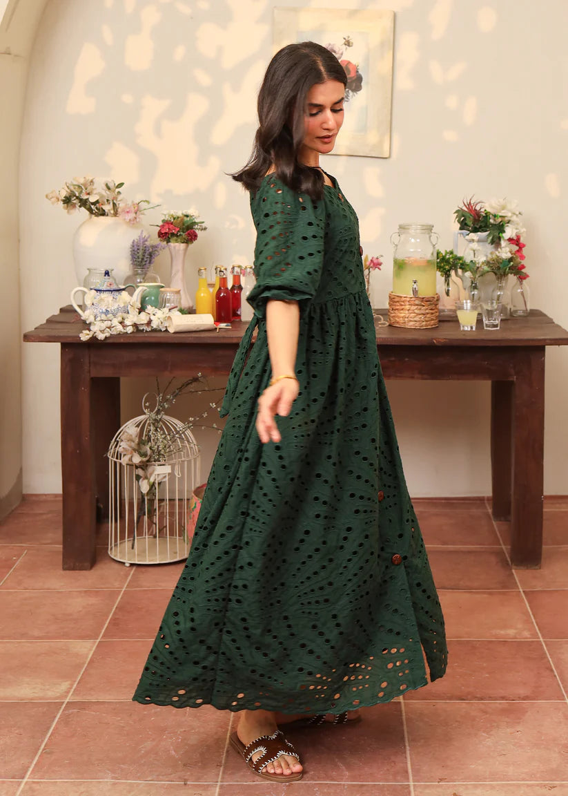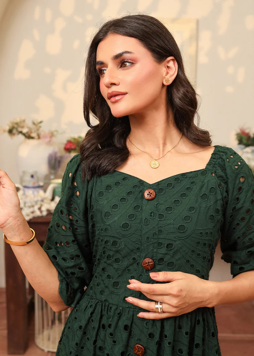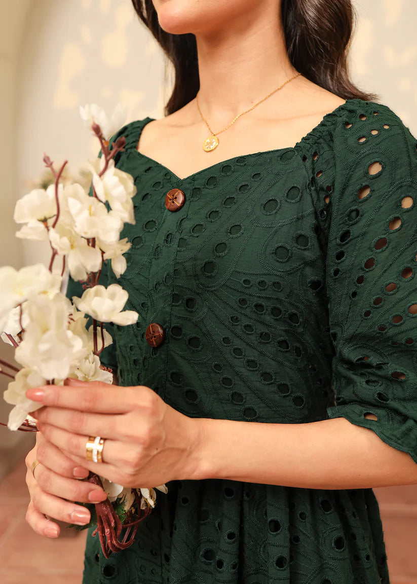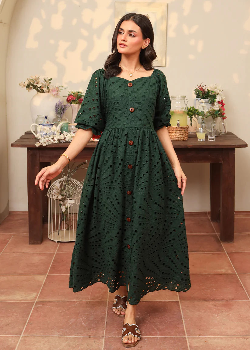 Crafted from flowing emerald green eyelet fabric, this dress features a captivating sweetheart neckline with button details along the length of the dress. Enchanting puffy elastic sleeves add a touch of romance, while the skirt is beautifully finished with intricate scallop edges, adding a dreamy, graceful charm to every step.