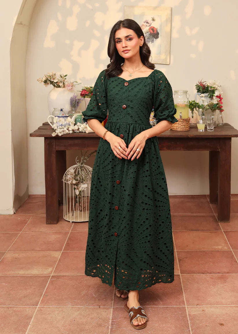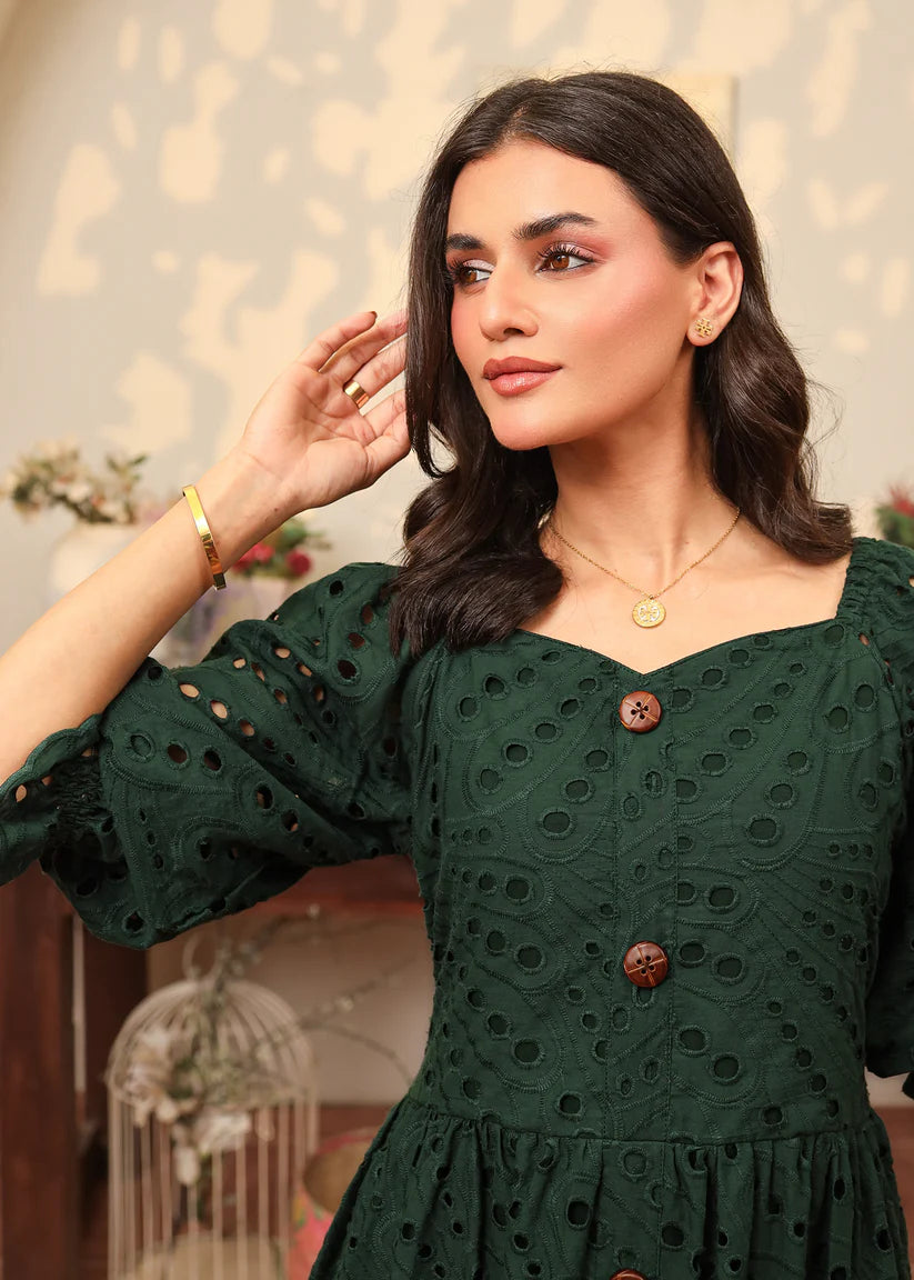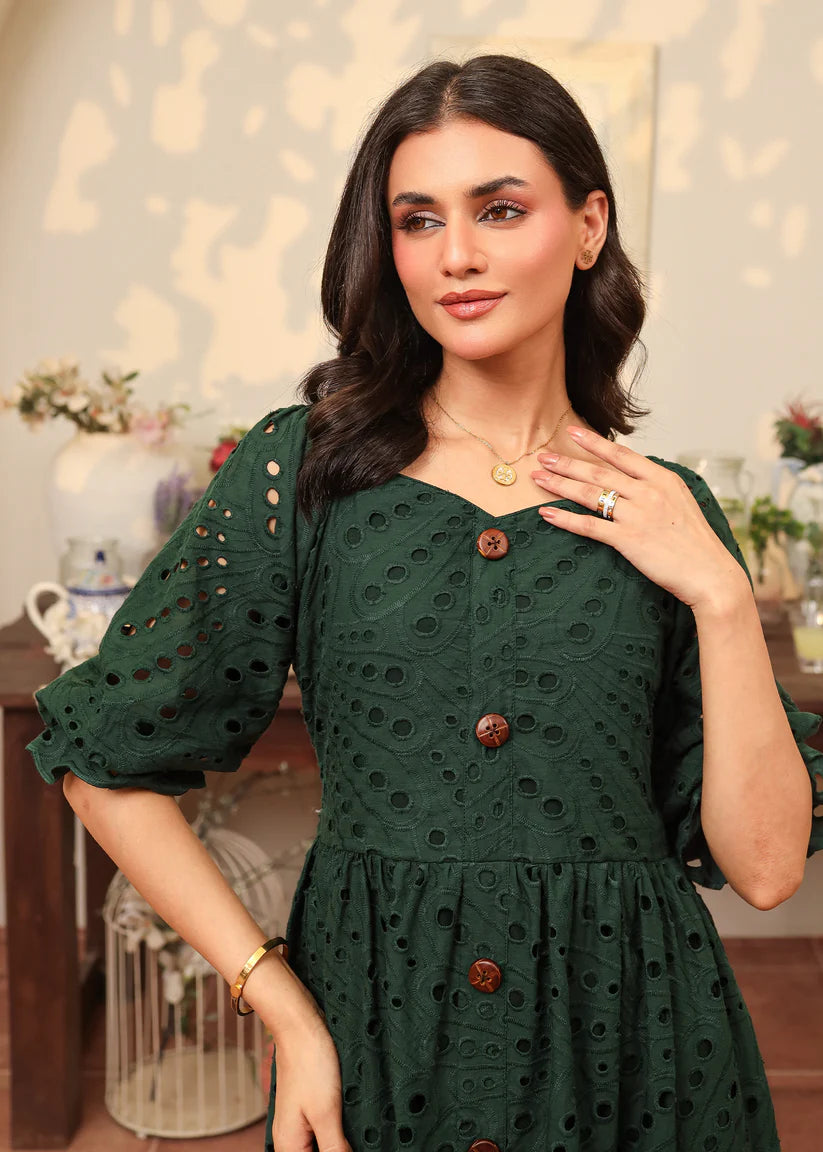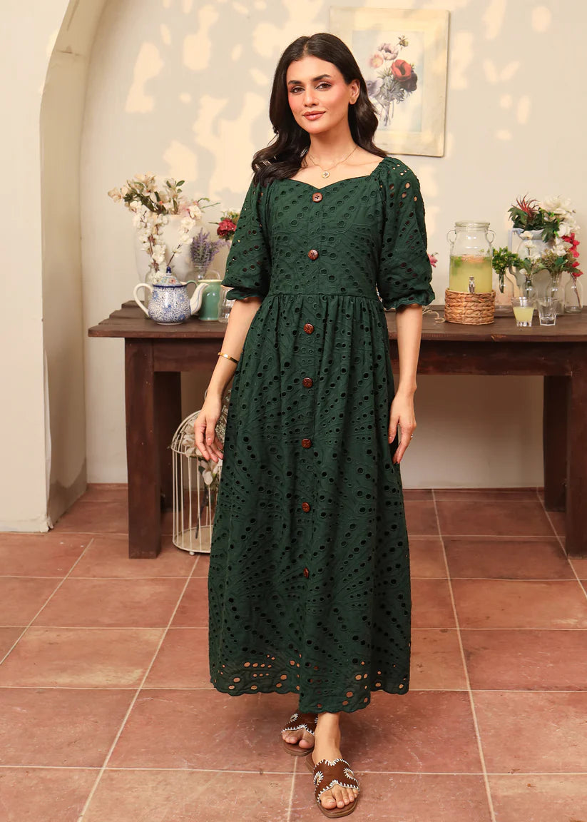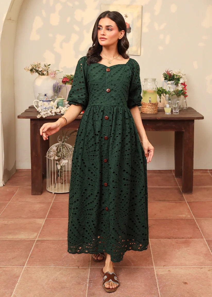 Crafted from flowing emerald green eyelet fabric, this dress features a captivating sweetheart neckline with button details along the length of the dress. Enchanting puffy elastic sleeves add a touch of romance, while the skirt is beautifully finished with intricate scallop edges, adding a dreamy, graceful charm to every step.