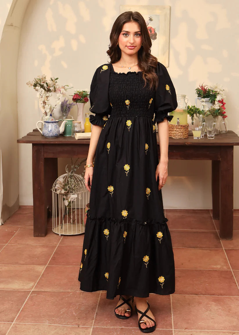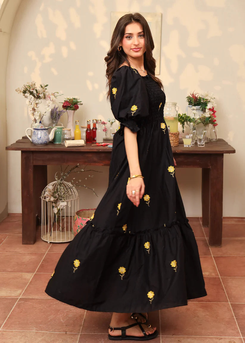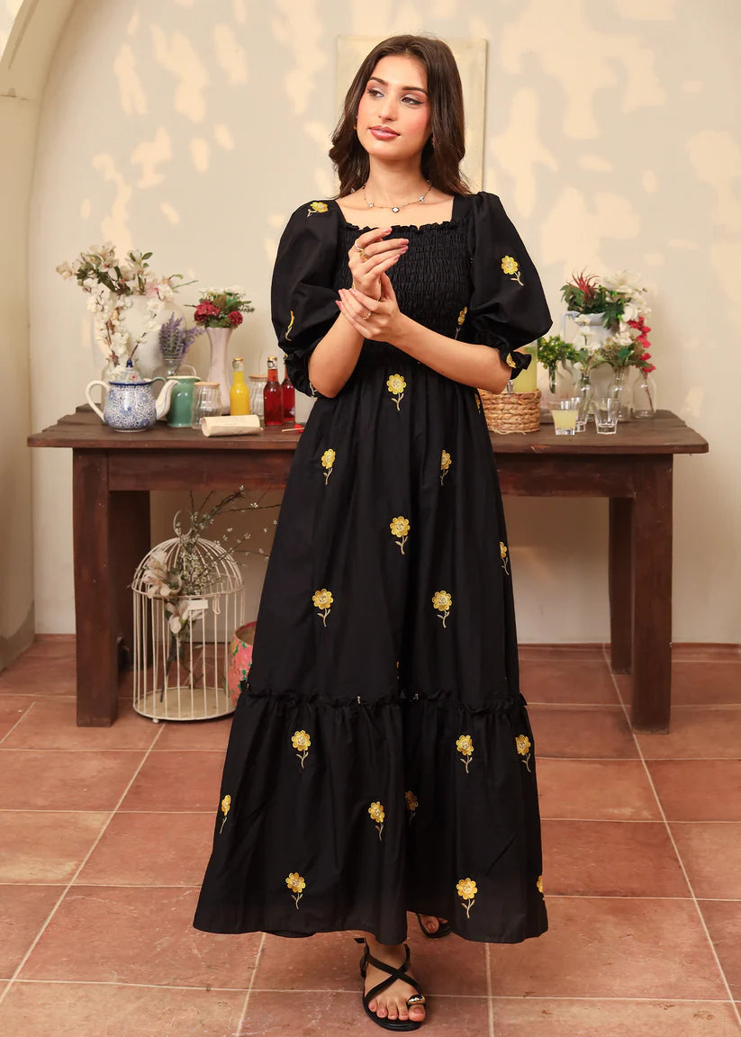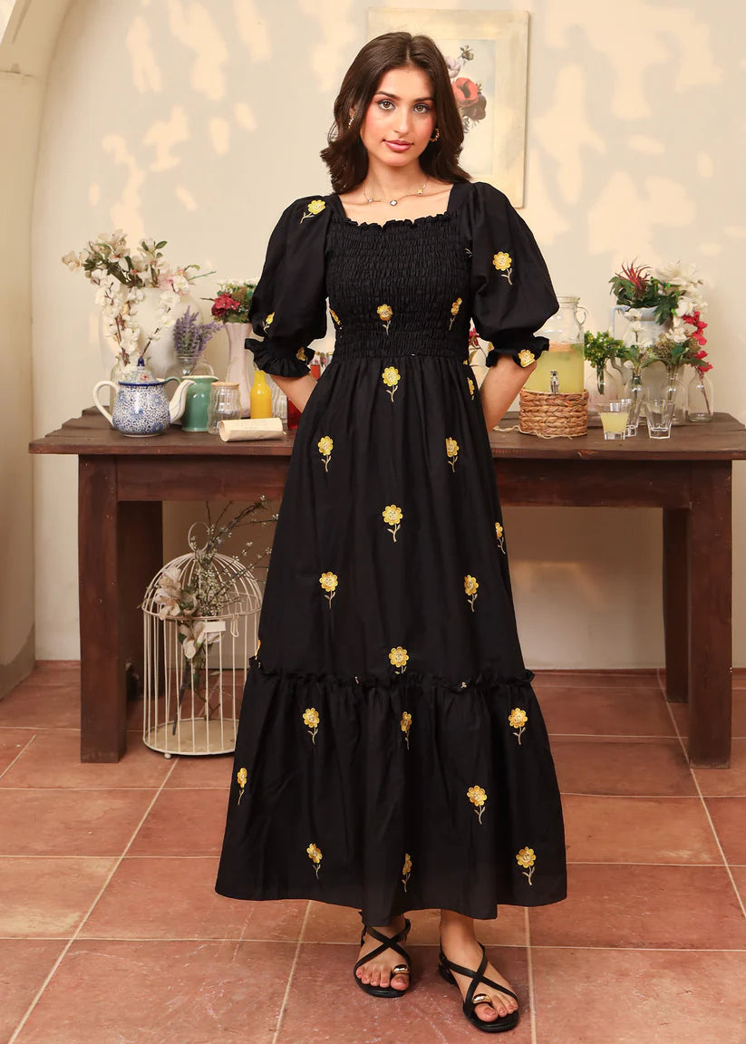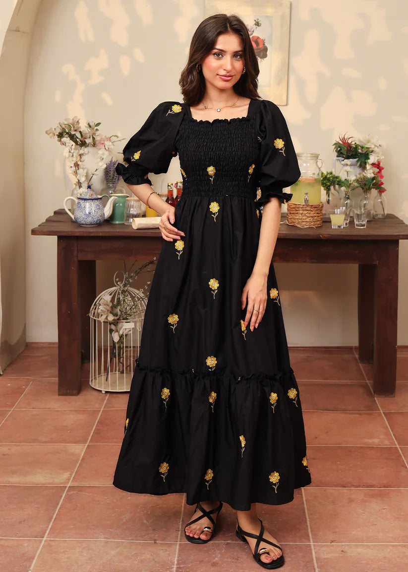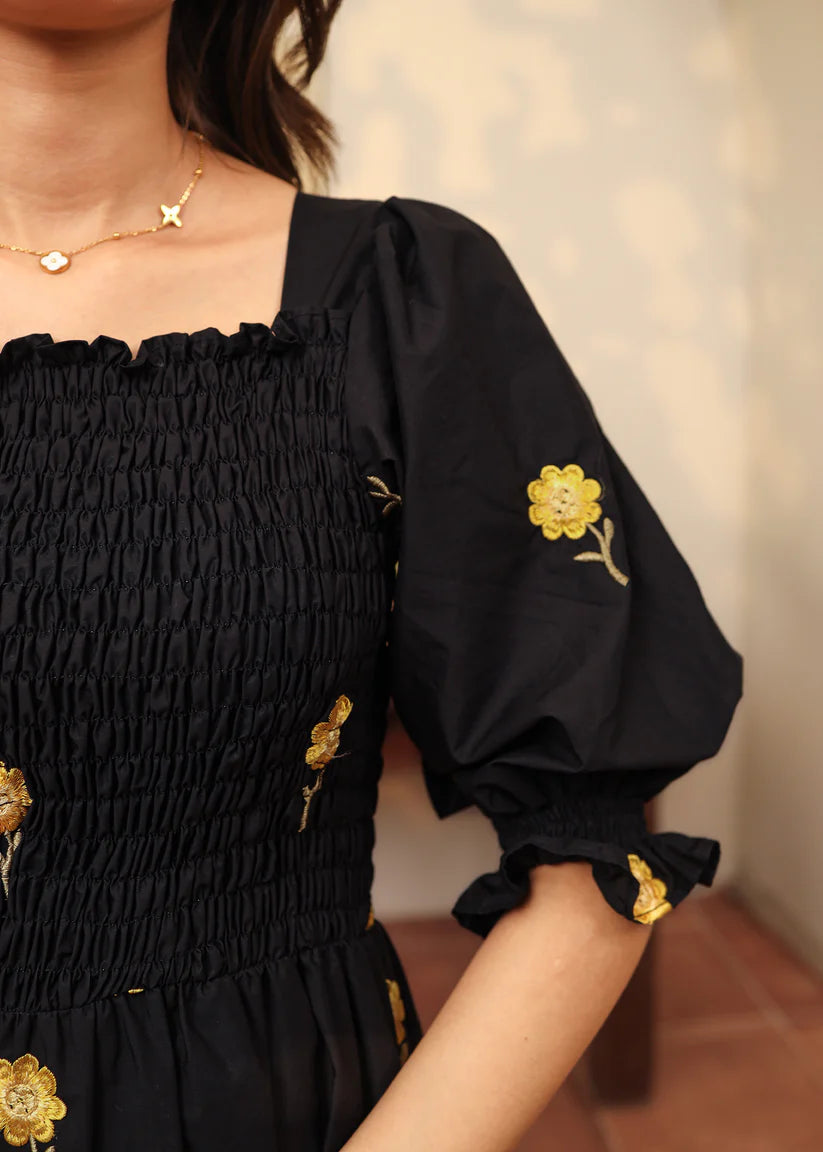 June is a sunflower embroidered cotton dress featuring our all time favorite smocked bodice with puffy elastic sleeves and a bottom frill for extra flair.