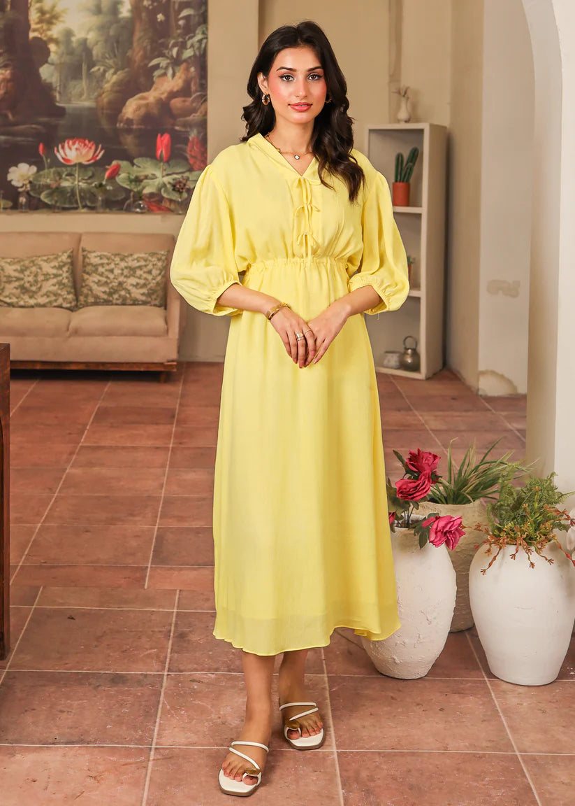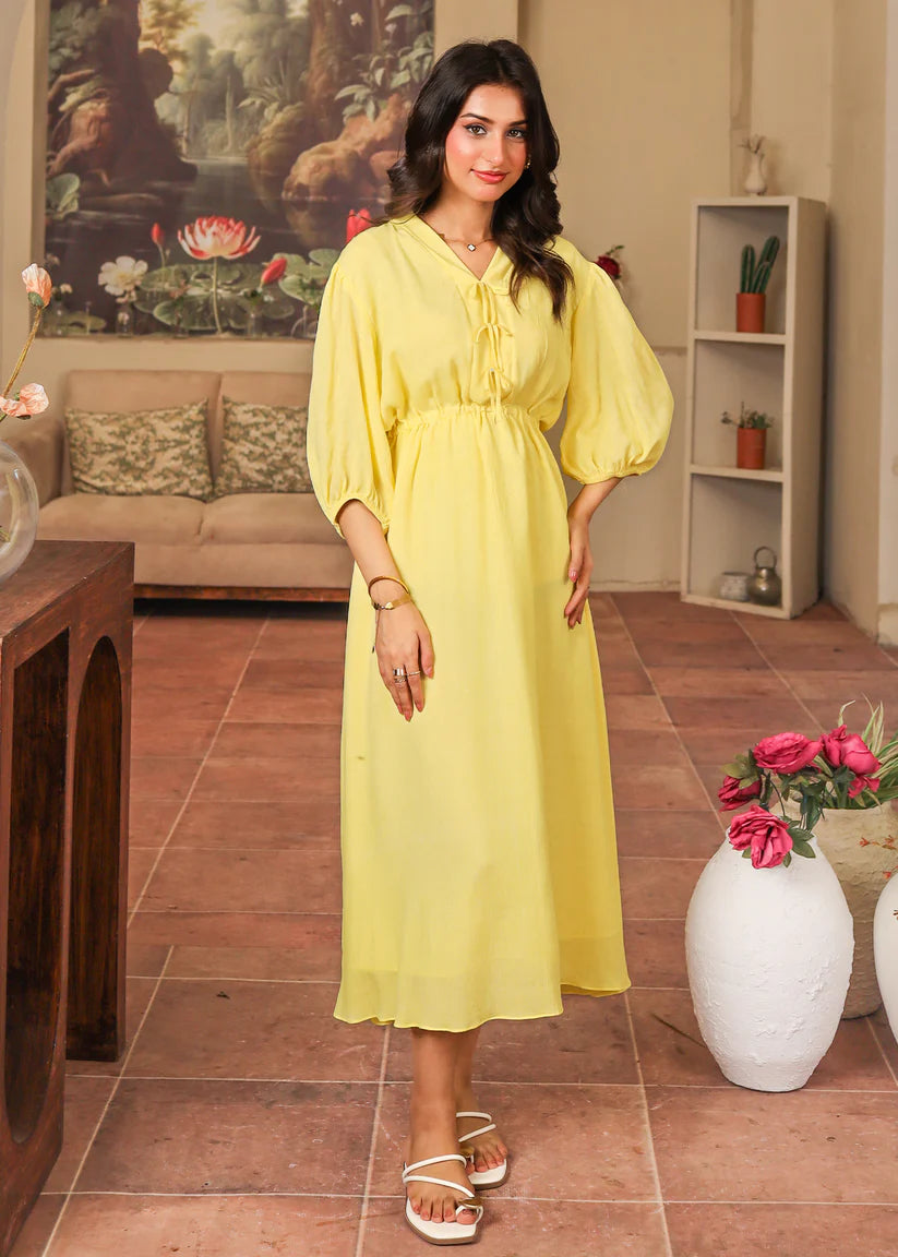 A timeless blend of charm and grace — this lime yellow dress features a flattering overlap V-cut neckline, with the cutest bows on the bodice with pearl details, and elegant puffy elbow-length sleeves. Designed to move with you, it’s the perfect piece for effortless summer days.