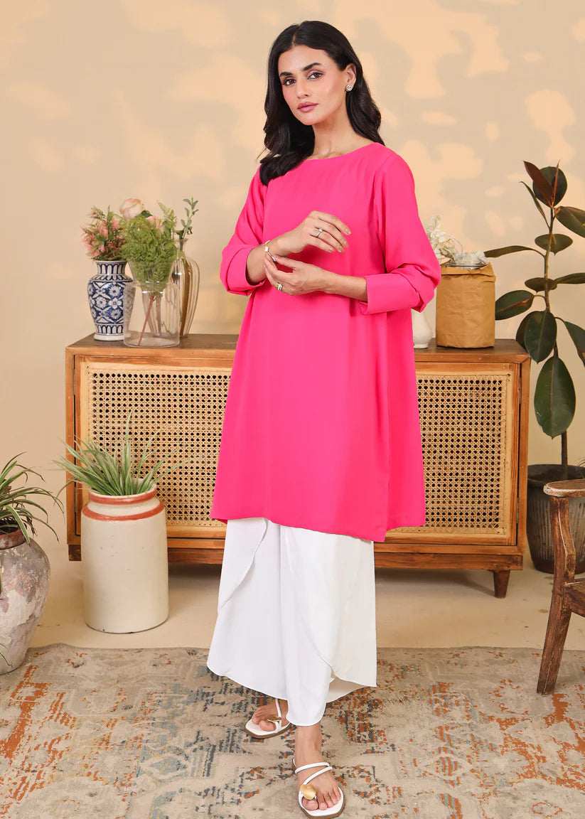 Product Description:The flowy pink tunic features a clean silhouette with a round neckline and three-quarter sleeves. Paired with white tulip-cut trousers, this two-piece set offers a chic yet comfortable look that's perfect for casual outings, brunches, or smart daywear.